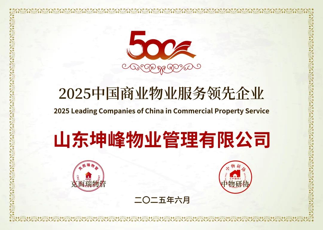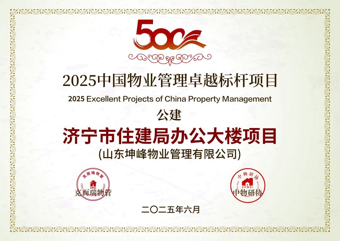 在「2025中國(guó)物業(yè)服務(wù)企業(yè)綜合實(shí)力研究成果」中,山東坤峰物業(yè)管理有限公司榮獲“2025中國(guó)物業(yè)服務(wù)企業(yè)綜合實(shí)力500強(qiáng)第96名”、“2025中國(guó)商業(yè)物業(yè)服務(wù)領(lǐng)先企業(yè)”、“ 2025中國(guó)物業(yè)管理卓越標(biāo)桿項(xiàng)目—濟(jì)寧市住建局辦公大樓項(xiàng)目(公建)”、“2025中國(guó)物業(yè)杰出企業(yè)家—趙賢峰(山東坤峰物業(yè)管理有限公司董事長(zhǎng))”獎(jiǎng)項(xiàng)。